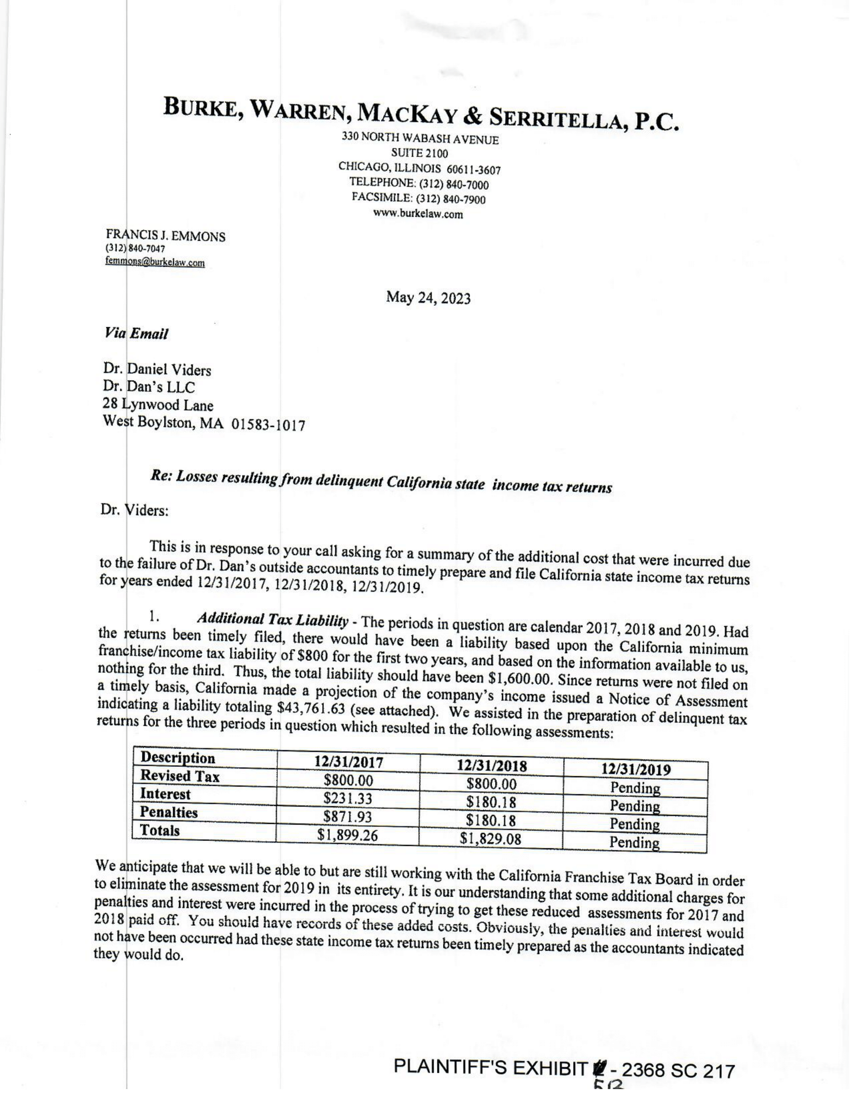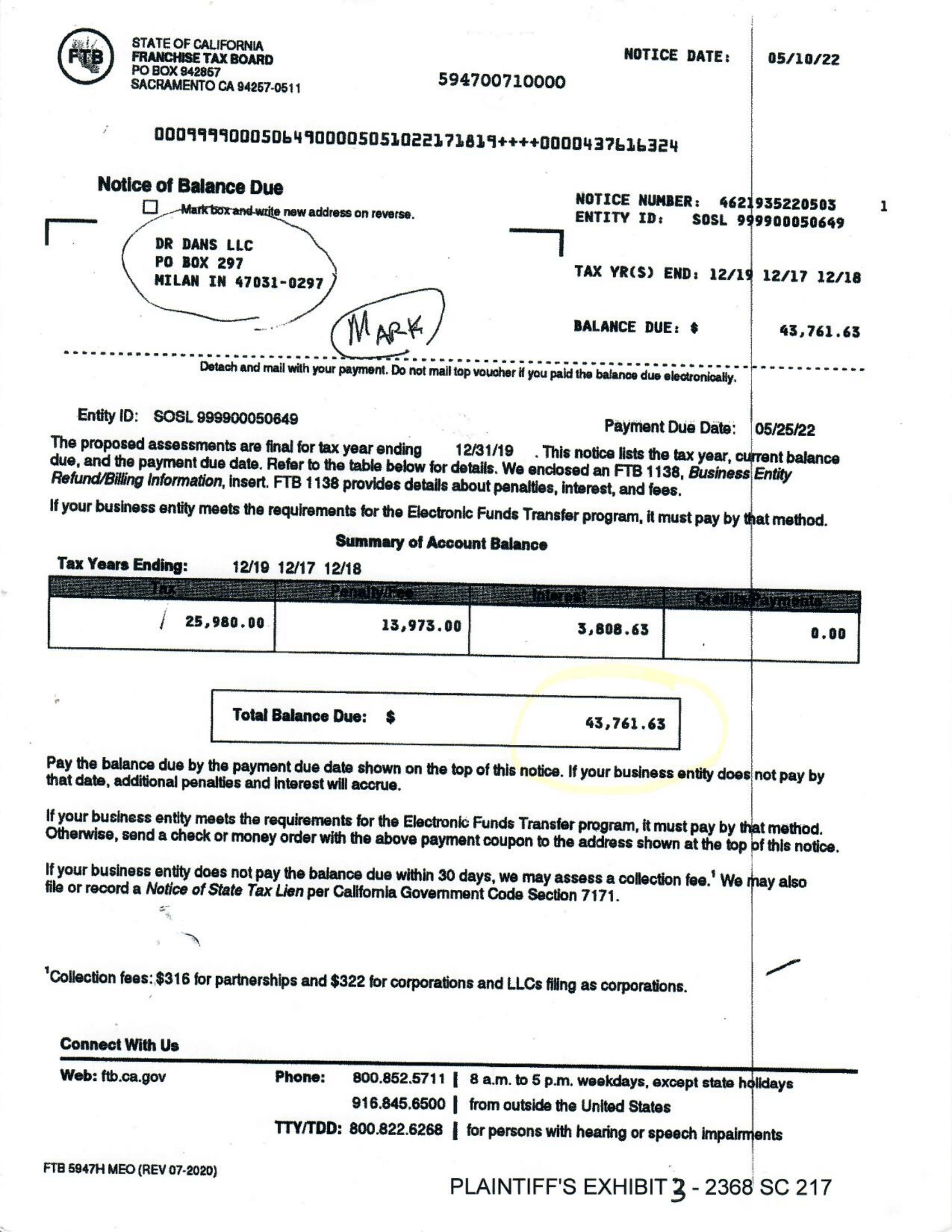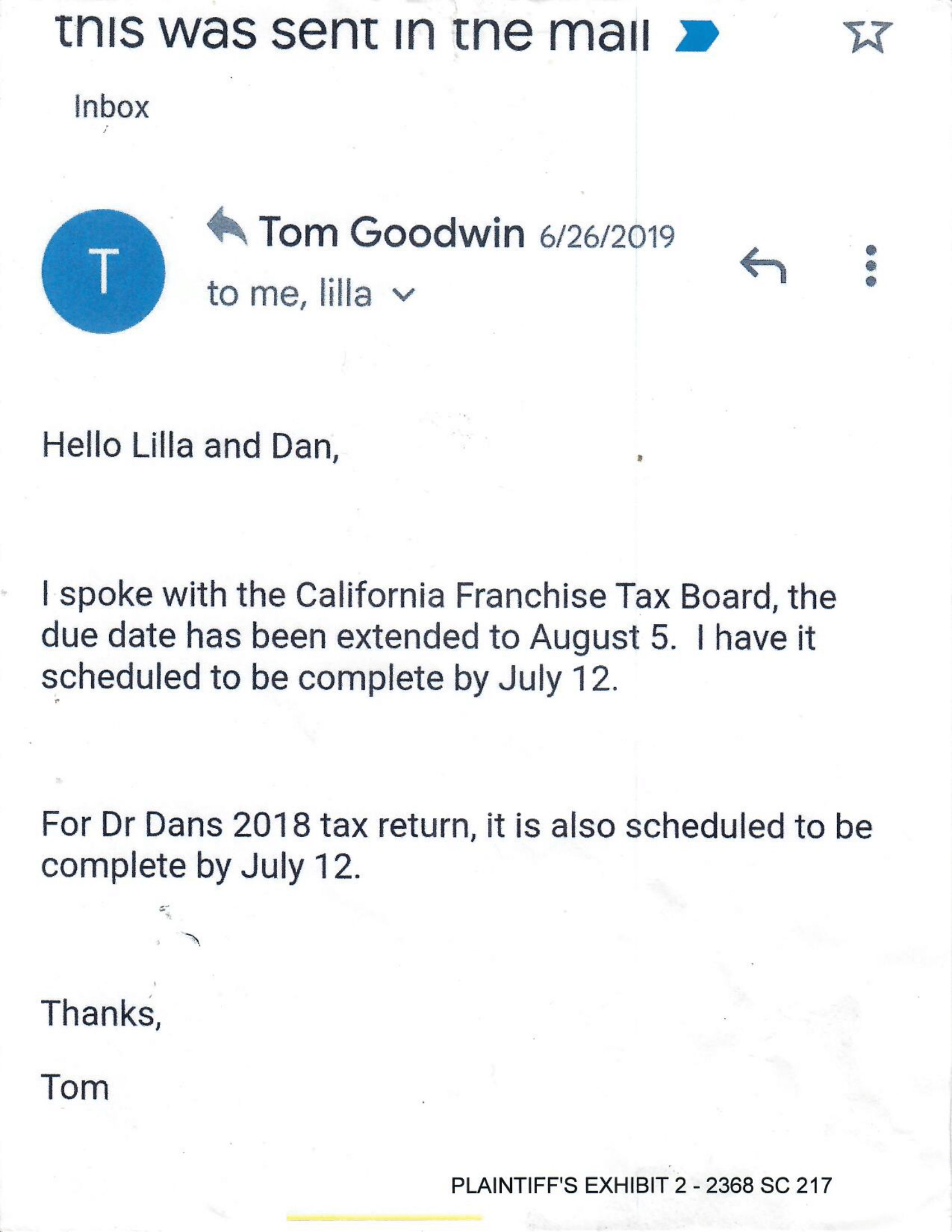 Due to the National Nature of our Business, we needed to file a tax return in California, and their employee, Tom Goodwin communicated that he would. SEE exhibit 2. He never filed said return resulting in a whopping $43,761.63 fine. SEE Exhibit 3.
