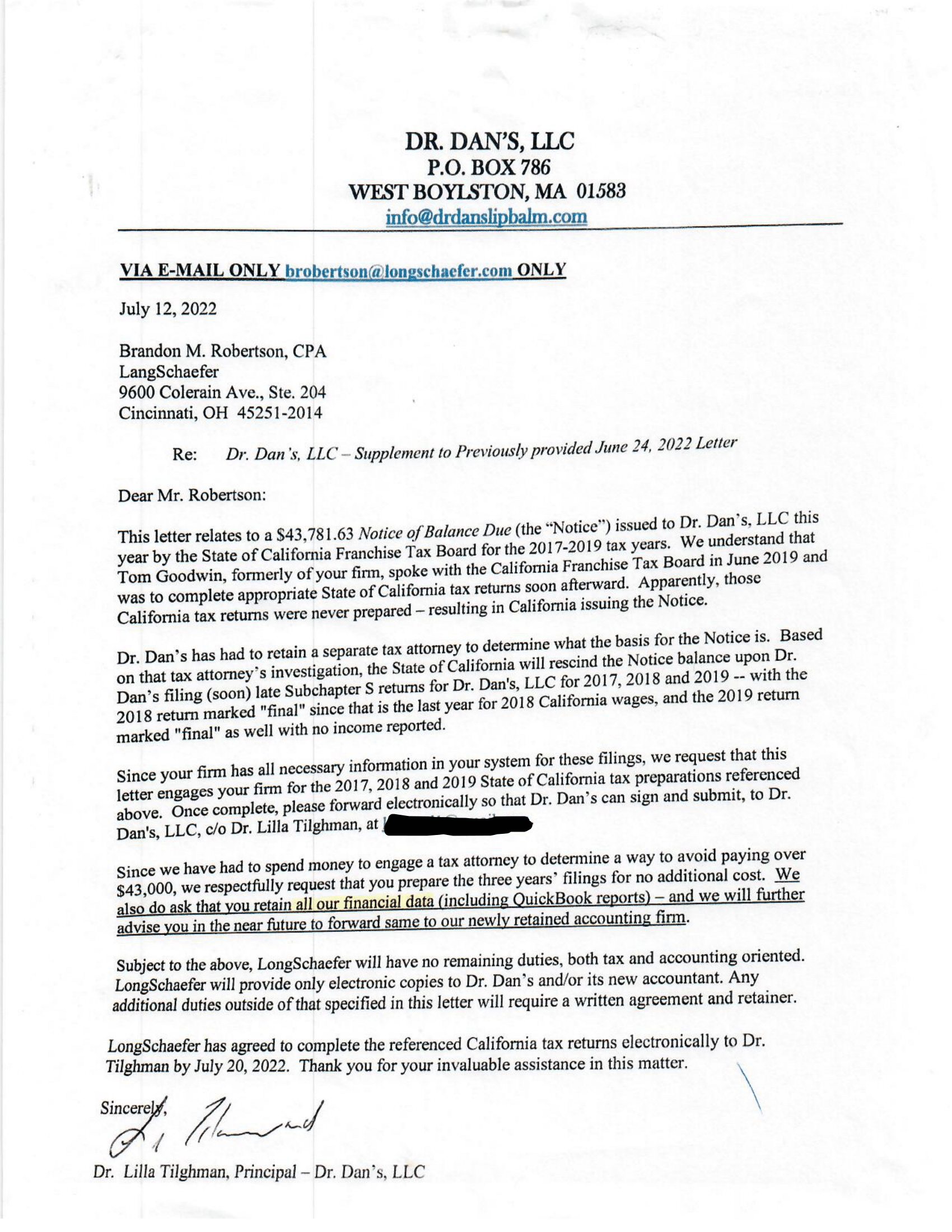 I am a Board certified Dermatologist in Massachusetts and my wife and I run a small pharmaceutical Company called Dr. Dan’s LLC makers of the world’s first truly medicated lip balm, Cortibalm ™ (https://drdanslipbalm.com). We hired Long Schaefer to be our accounts. SEE Exhibit 1 and 1A. Click/tap the documents below to view more.