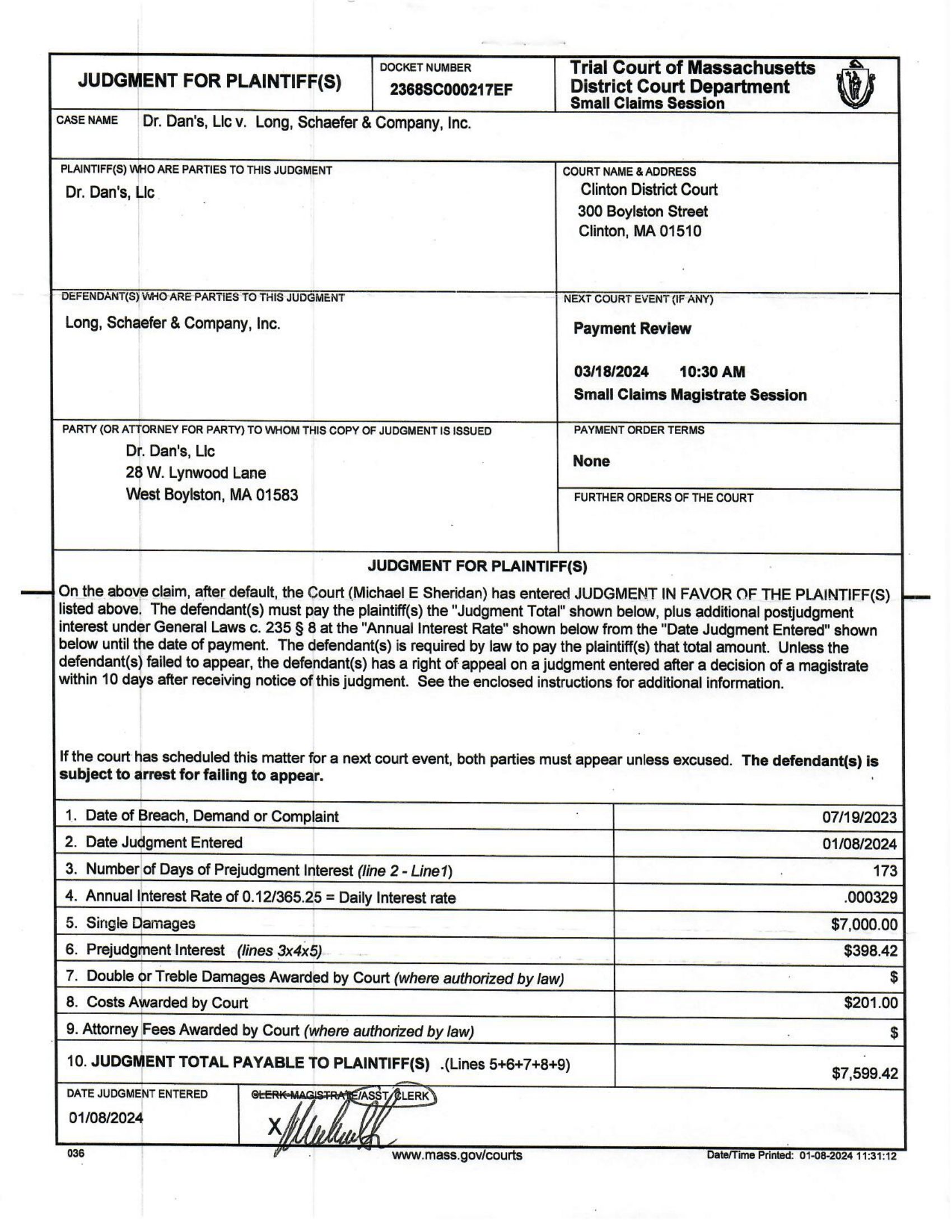 After failing to be reimbursed we filed an action in small claims court and we were awarded judgment. SEE Exhibit 6. Because the defendant never showed up and the facts of the case were merited by the magistrate we were awarded judgment. Mr. Robertson then appealed the verdict, and new trial was scheduled and again they failed to show up in court. To date, October 2025 they still have not paid this judgment.